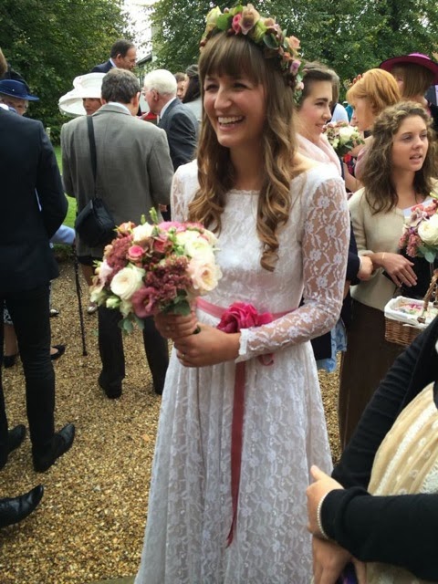 In her hair, a garland of Autumn blooms by R&R Saggers.