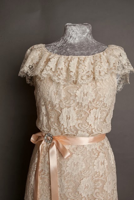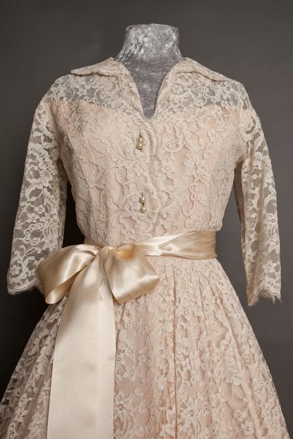 | Late 1950s / early 1960s blush lace wedding dress, ribbon with crystal, SOLD |