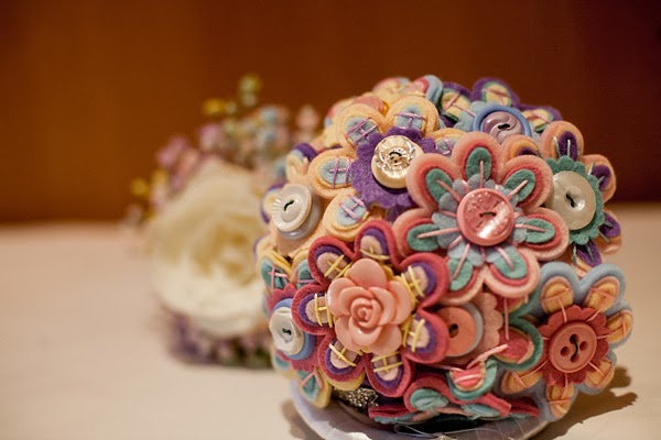 She carried the prettiest felt bouquet by Jennifer RaeAnd their beautiful bridesmaids wore blue dresses by For Her And For Him